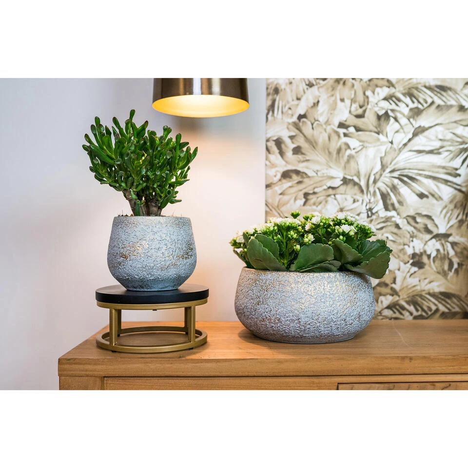 Plantenpot/bloempot van keramiek in de kleur metallic zilvergrijs met een touch of gold/goud finish patroon. Diameter 32 cm en hoogte 30 cm. Stijlvolle bloempotten voor binnen gebruik. Serie: Noor. De zeer stijlvolle pot met prachtig patroon aan de buitenzijde is met de hand gemaakt. Derhalve is geen pot exact hetzelfde en hebben de bloempotten een echt karakter. Tip: zet een schotel onder een bloempot van klei of gebruik een binnenpot/hoes of coating om eventueel lekken tegen te gaan. Potten van gebakken klei zijn niet altijd 100% gegarandeerd waterdicht.