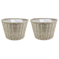 Plantenpot/bloempot/mand van gerecycled gevlochten kunststof met een diameter van 45 cm en een hoogte van 31 cm in de kleur lichtbruin/beige. Voor binnenshuis en buitenshuis gebruik. De pot mand heeft een binnenkant van plastic. Voor kamerplanten en bloemen of kunstplanten. Gaat langer mee dan echt riet. Natuurlijke rotan look.