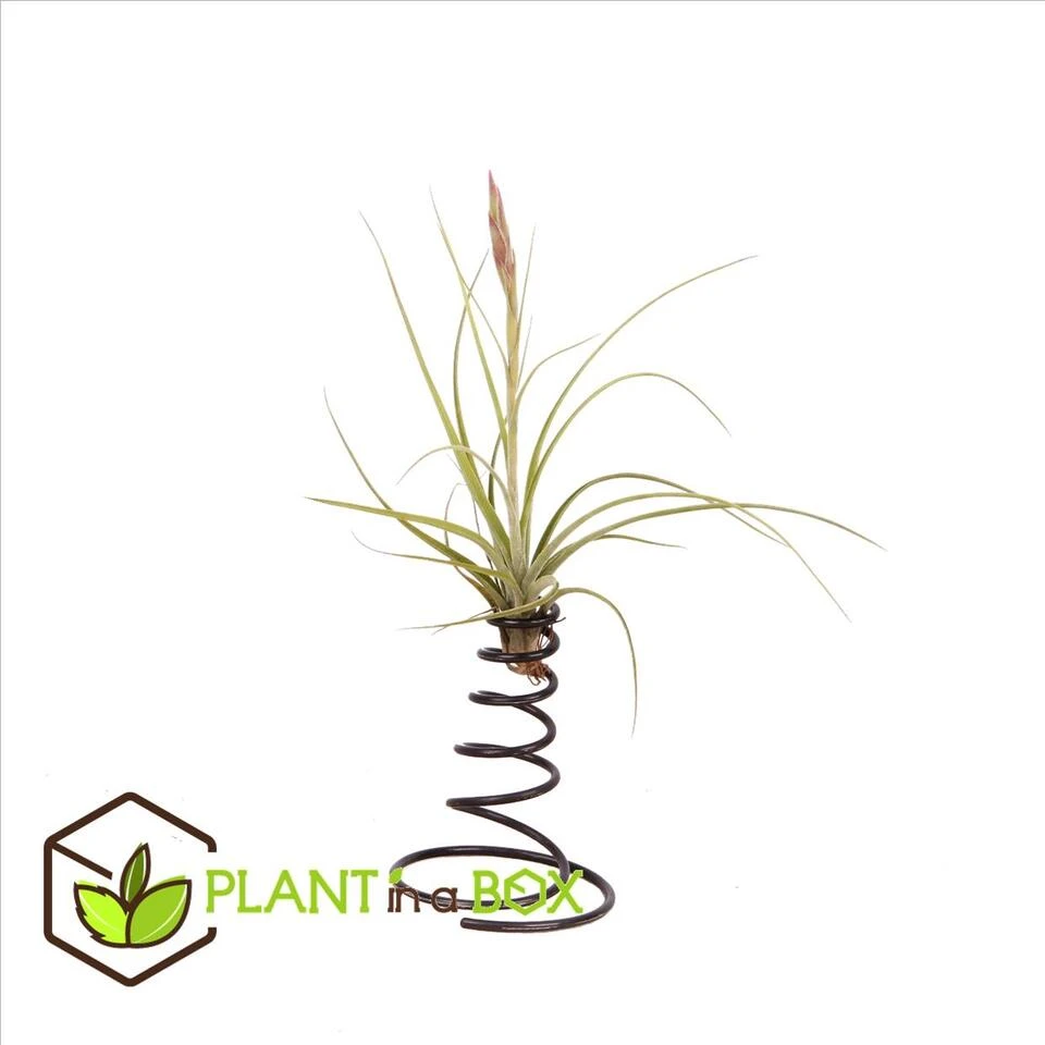 Drie verschillende Tillandsia luchtplantjes op een decoratieve spiraal. De Tillandsia is een familie van de Bromelia’s en telt meer dan 400 soorten. Het is een van de meest geΓ―nstagramde planten van dit moment! De naam komt van de Zweedse botanicus Elia Tillands, die net als de Tillandsia een hekel had aan water. De planten komen oorspronkelijk uit de bossen, woestijnen en bergen van Zuid- en Midden-Amerika. Bijna alle Tillandsia zijn epifyten, dat wil zeggen dat ze geen of nauwelijks wortels hebben maar op bomen of rotsen groeien. Water en voedingsstoffen worden uit de lucht opgenomen door de schubben op de bladeren, daarom worden de Tillandsia’s ook vaak luchtplanten genoemd.