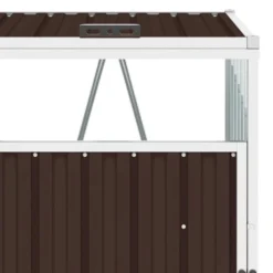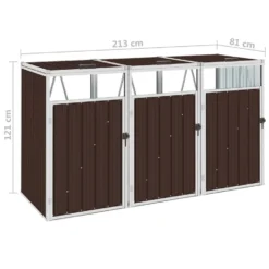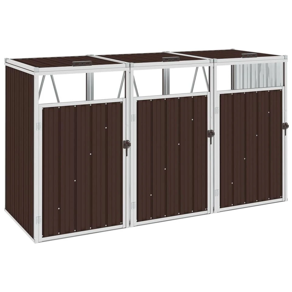 Deze driedubbele berging is gemaakt van stevig gegalvaniseerd staal, waardoor hij zeer stabiel en onderhoudsvriendelijk is. Hij is uitgerust met drie individuele deuren aan de voorkant en zwarte kunststof deurgrepen, zodat de afvalbakken gemakkelijk verwijderd en geleegd kunnen worden. De berging beschikt over drie individuele hefdeksels die kunnen worden geopend om afval eenvoudig weg te gooien.