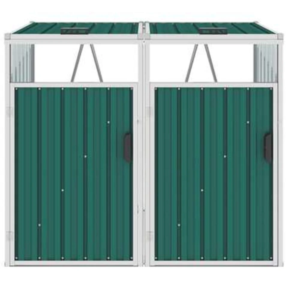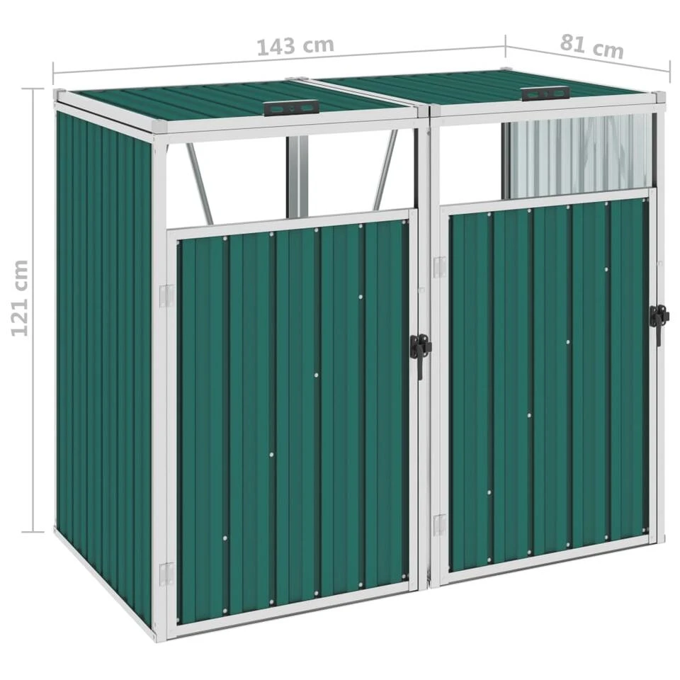 Deze dubbele berging is gemaakt van stevig gegalvaniseerd staal, waardoor hij zeer stabiel en onderhoudsvriendelijk is. Hij is uitgerust met twee individuele deuren aan de voorkant en zwarte kunststof deurgrepen, zodat de afvalbakken gemakkelijk verwijderd en geleegd kunnen worden. De berging beschikt over twee individuele hefdeksels die kunnen worden geopend om afval eenvoudig weg te gooien.