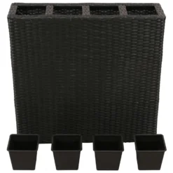 Deze plantenbak is gemaakt van duurzaam, waterbestendig rattan en is de perfecte aanvulling op je buitenruimte. De strakke weefstructuur zorgt voor een gladde afwerking en goede stabiliteit. De plantenset bestaat uit 4 kunststof potten waardoor de set een lange levensduur heeft. Je kunt allerlei planten en bloemen netjes in de potten plaatsen.
