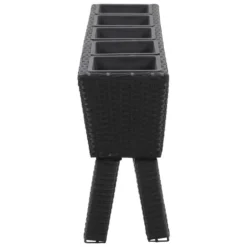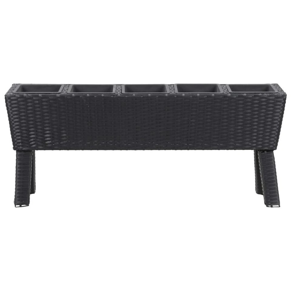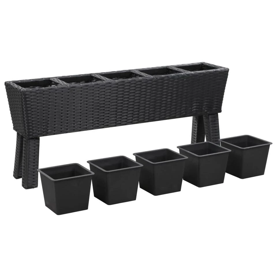 Deze mooie verhoogde tuinbakkenset bestaat uit 1 poly rattan plantenbak met poten en 5 potten.