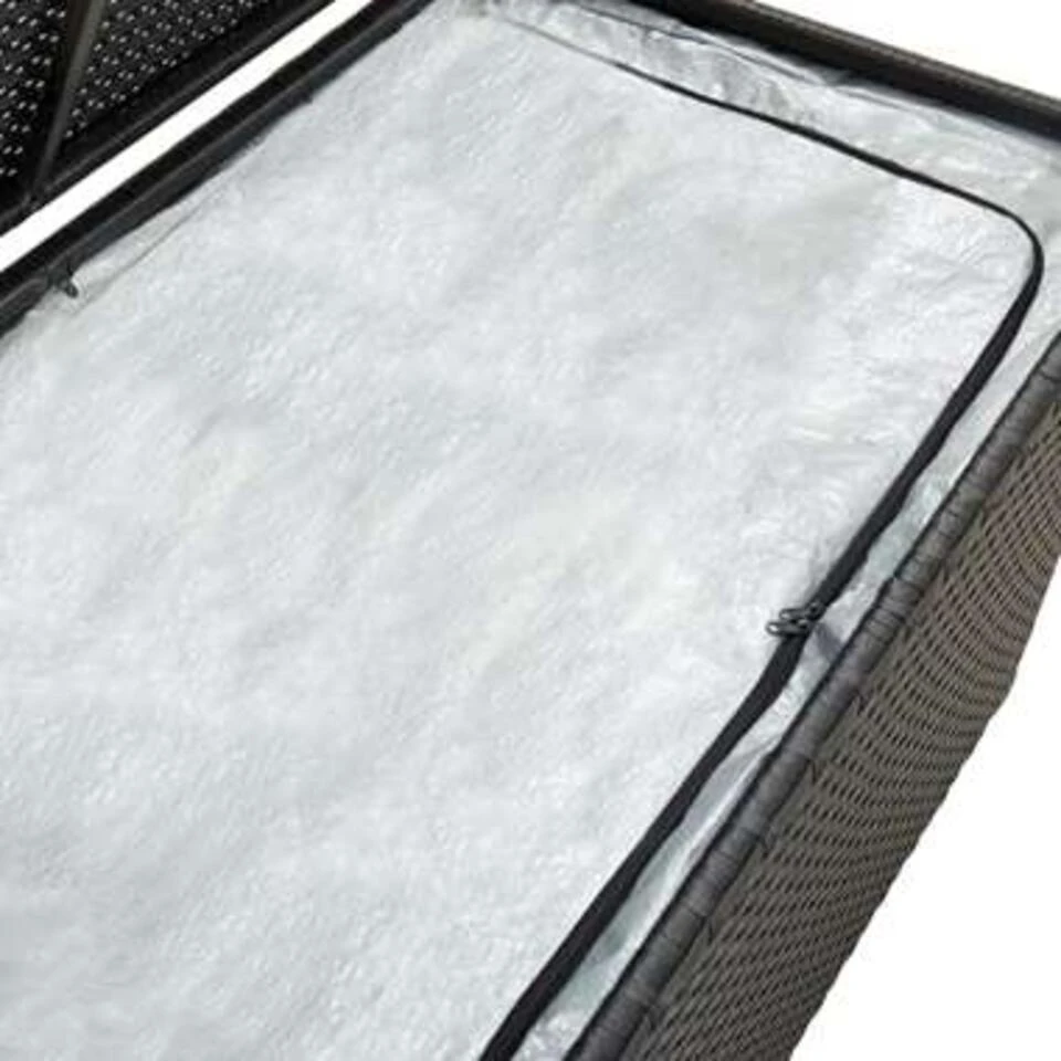 De box heeft een grote inhoud en is dus groot genoeg om tuinartikelen op te slaan, bijvoorbeeld: meubelkussens, dekens, zwembadspeelgoed en tuinspullen. Deze opbergbox is gemaakt van een gepoedercoat stalen frame en handgeweven poly rattan, dat duurzaam en roest- en weerbestendig is. De voering met ritssluiting beschermt de inhoud tegen stof en vocht. Dankzij de verhoogde voeten zorgt deze opbergbox voor een goede luchtcirculatie en houdt hij de inhoud droog en schoon. Hij is gemakkelijk schoon te vegen met een vochtige doek.