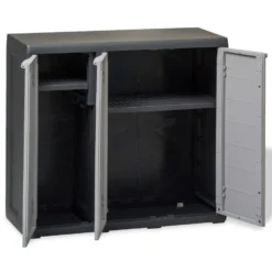 Onze hoogwaardige opslagkast is ideaal voor het opbergen en organiseren van je huishoudelijke spullen, gereedschap en andere spullen in de tuin of op het terras, enz. Deze kast past bij iedere inrichting dankzij het tijdloze ontwerp.