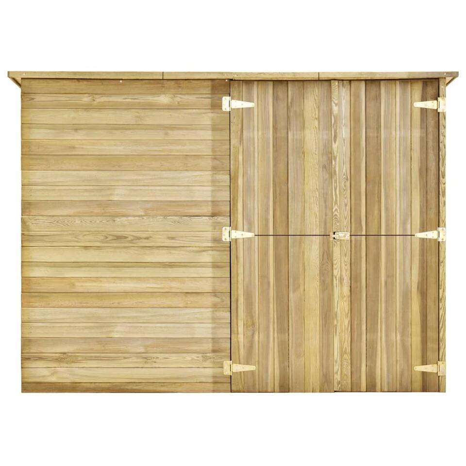 Deze schuur is gemaakt van hoogwaardig, geïmpregneerd grenenhout en is duurzaam en weerbestendig. Het dak is bedekt met asfaltvilt, dat de schuur beschermt tegen vocht. Hij heeft een ontwerp met dubbele deuren voor gemakkelijke toegang. Bovendien biedt de dubbele deur met vergrendeling extra beveiliging.